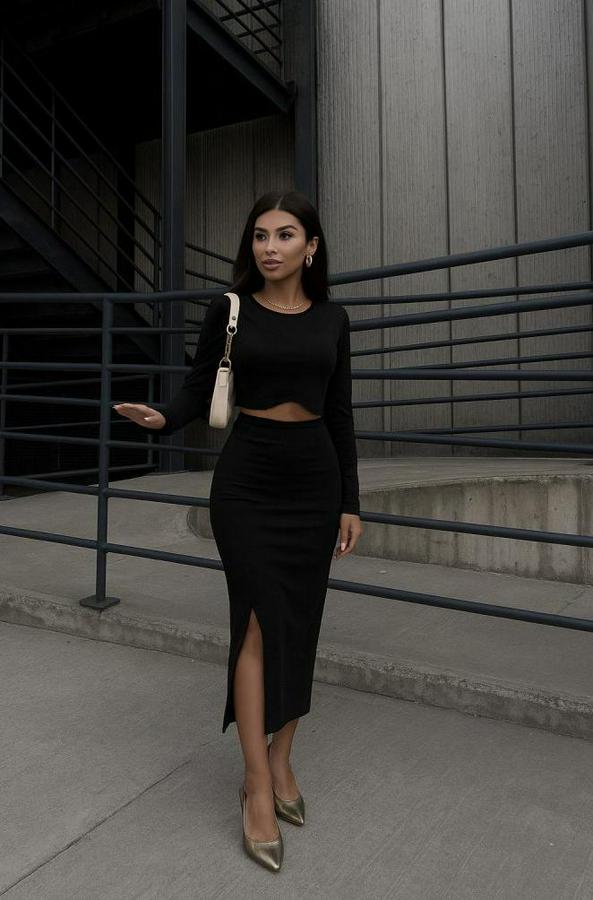 Kadın Uzun Kollu Bisiklet Yaka Kısa Krop Dalgıç Bluz Ile önden Yırtmaçlı Uzun Etek Ikili Takım