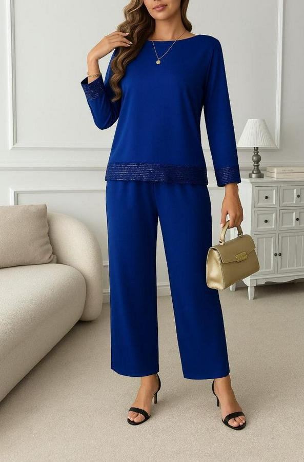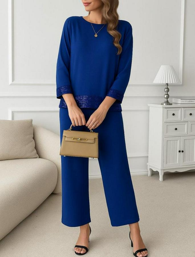 Uzun Kollu Bisiklet Yaka Pulpayetli Viskon Iki Iplik Bluz Ve Pantolon Ikili Takım
