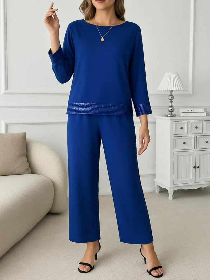 Kadın Uzun Kollu Bisiklet Yaka Pulpayetli Viskon Iki Iplik Bluz Ve Pantolon Ikili Takım