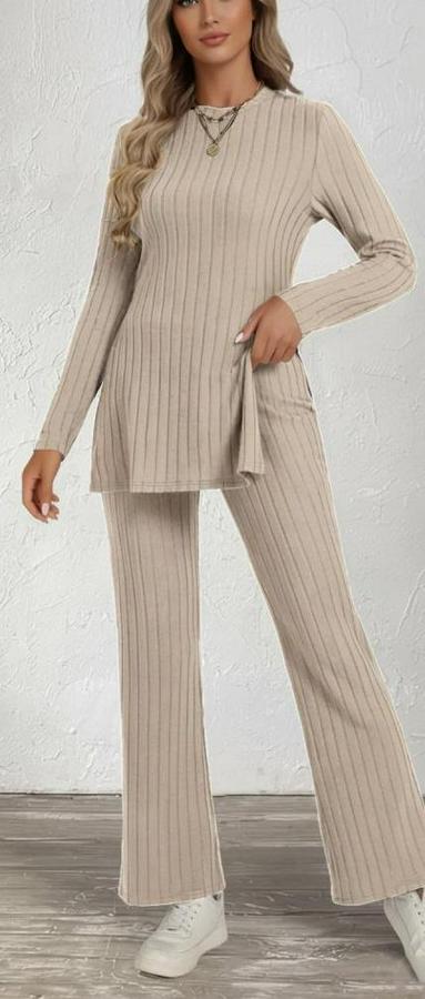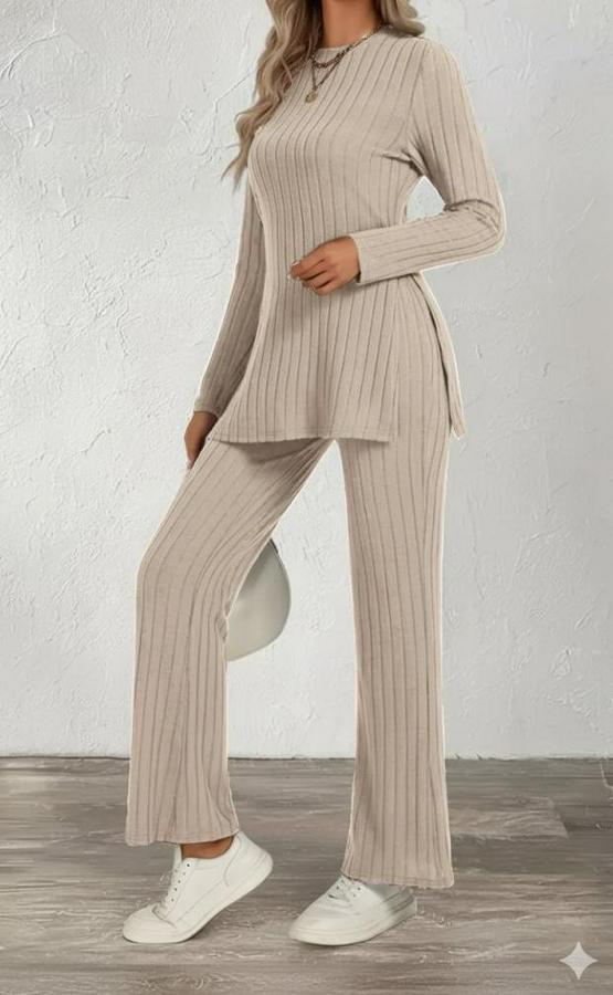 Kadın Uzun Kollu Bisiklet Yaka Yandan Yırtmaçlı şardonlu Kaşkorse Bluz Ve Pantolon Ikili Takım