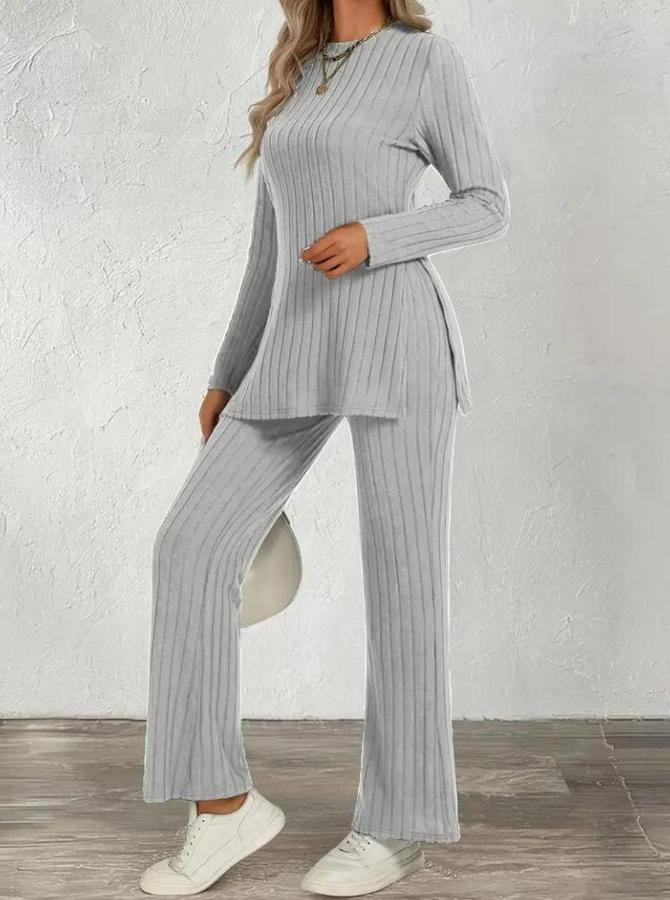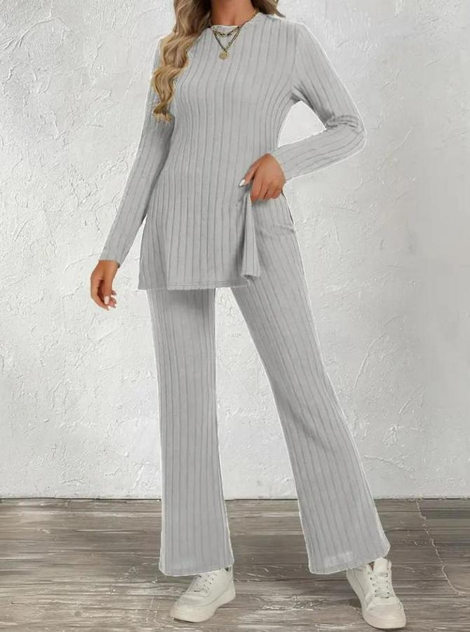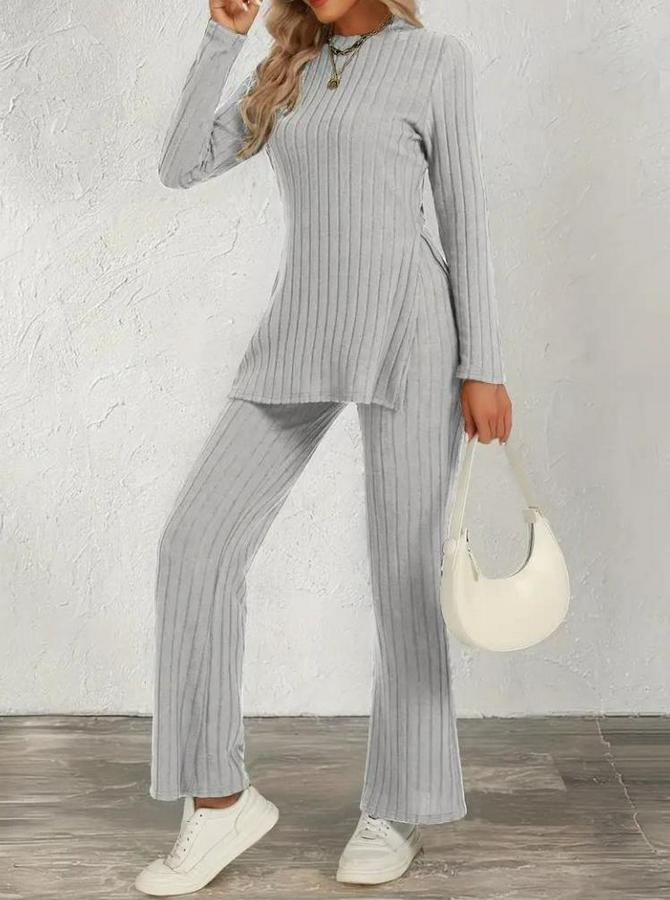 Kadın Uzun Kollu Bisiklet Yaka Yandan Yırtmaçlı şardonlu Kaşkorse Bluz Ve Pantolon Ikili Takım