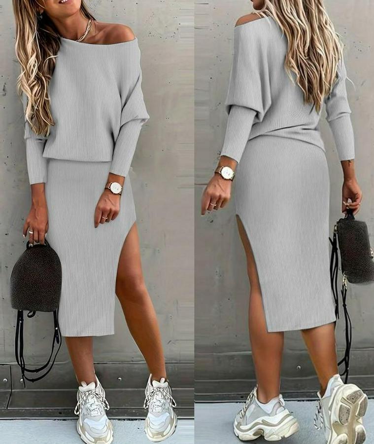 Kadın Uzun Kollu Düşük Omuz Yırtmaç Detay Kaşkorse Etek Bluz Ikili Takım