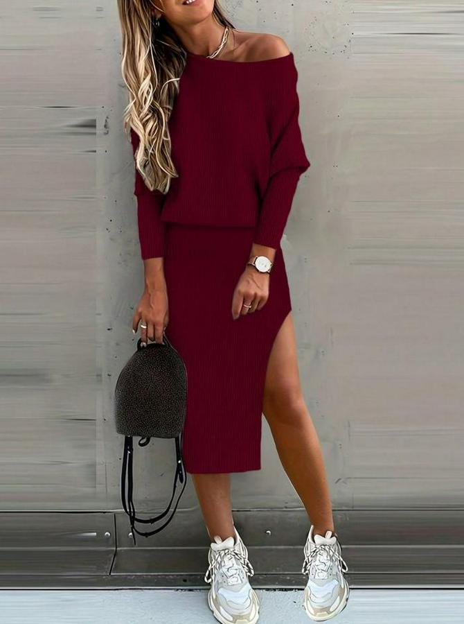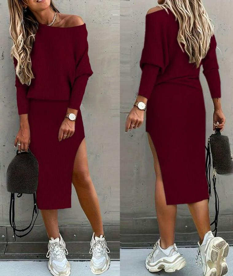 Kadın Uzun Kollu Düşük Omuz Yırtmaç Detay Kaşkorse Etek Bluz Ikili Takım