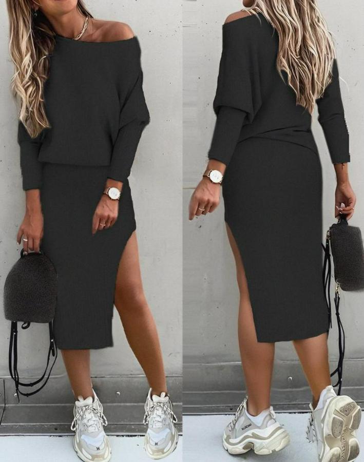Kadın Uzun Kollu Düşük Omuz Yırtmaç Detay Kaşkorse Etek Bluz Ikili Takım
