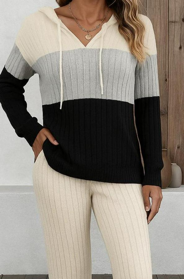 Kadın Uzun Kollu Kapşonlu Bağcıklı Blok Renkli şardonlu Kaşkorse Bluz Ve Pantolon Ikili Takım