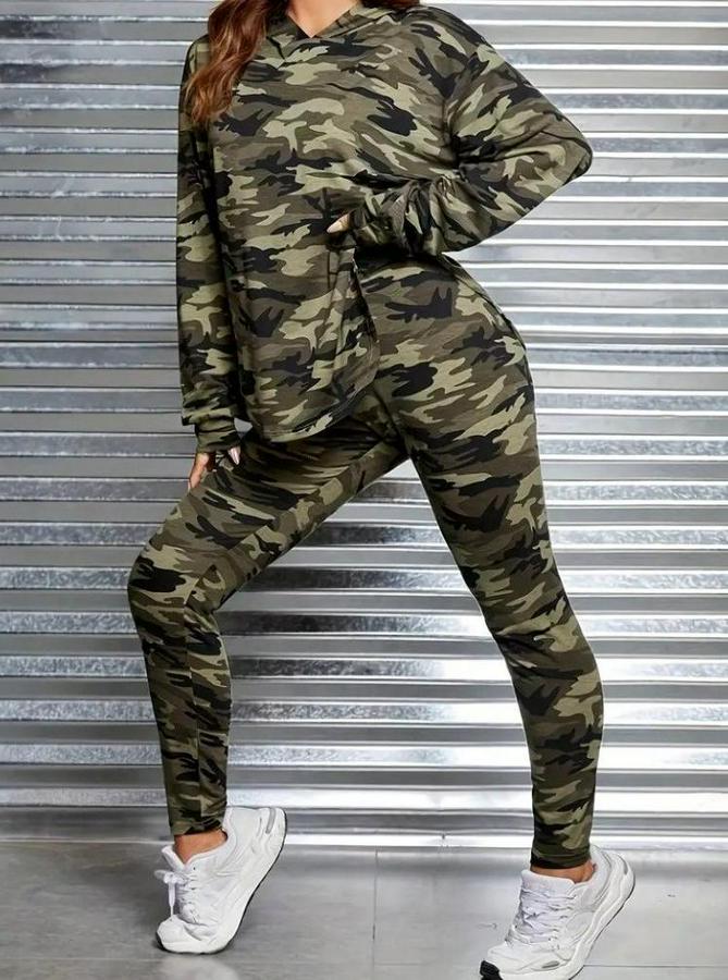 Uzun Kollu Kapşonlu Kamuflaj Desenli Bluz Ve Pantolon Tayt Ikili Takım