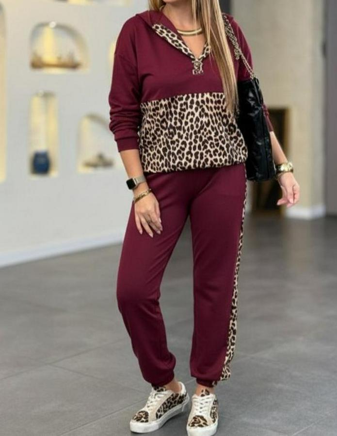 Uzun Kollu Kapşonlu Leopar Desen Detaylı Viskon Iki Iplik Bluz Ve Pantolon Ikili Takım