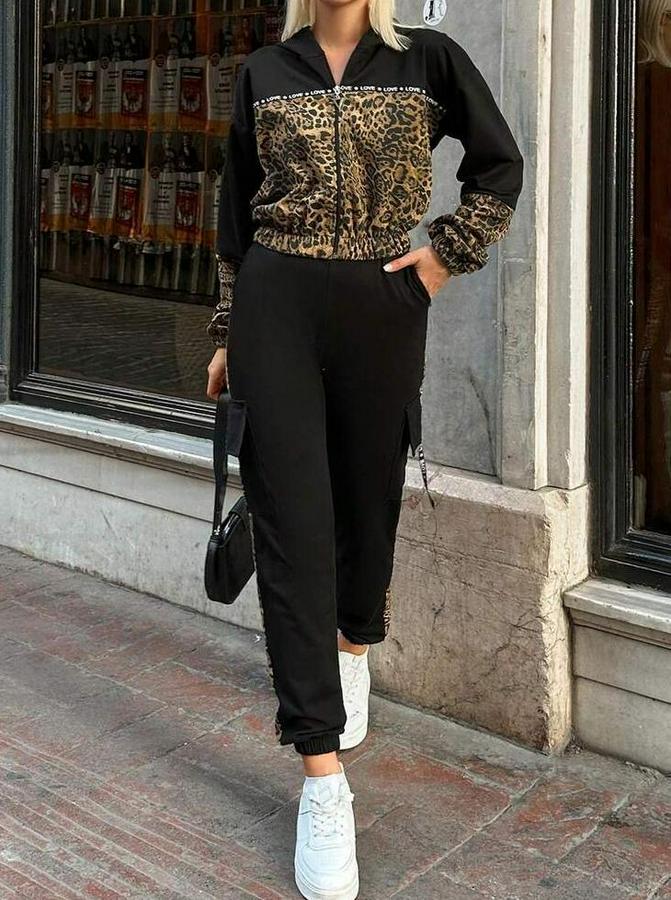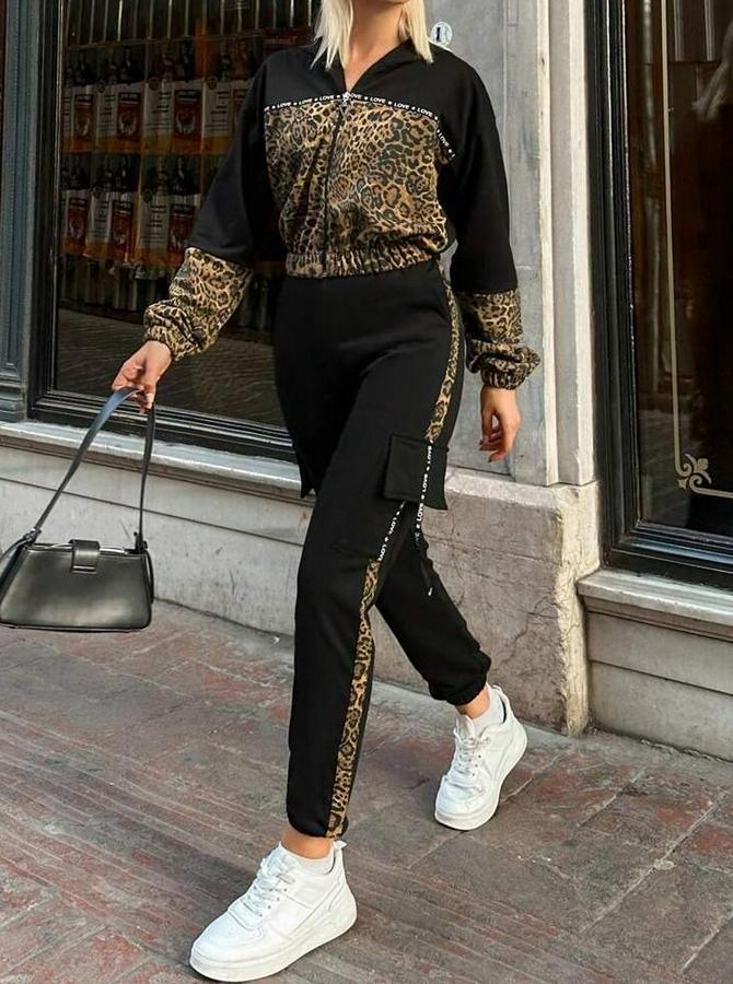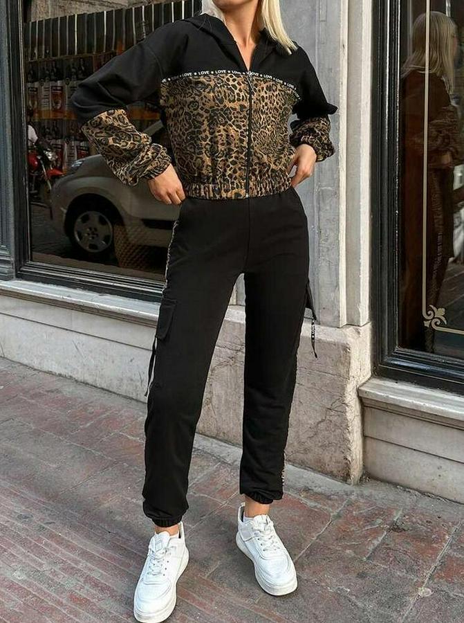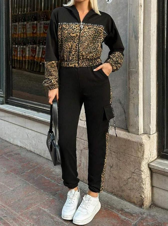 Uzun Kollu Kapşonlu Leopar Desenli Viskon Iki Iplik Bluz Ve Pantolon Ikili Takım