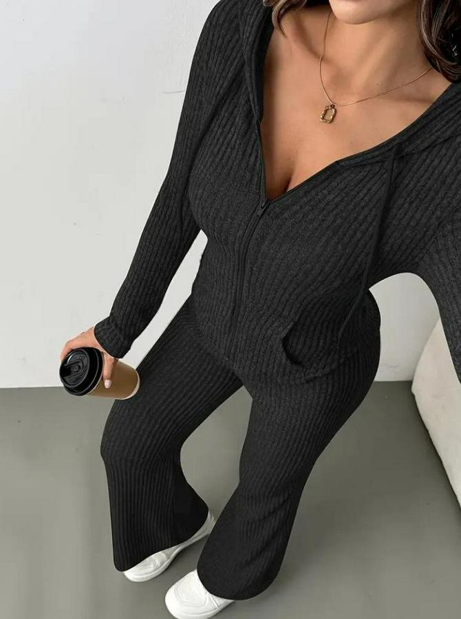 Kadın Uzun Kollu Kapşonlu önden Fermuarlı Kaşkorse Bluz Ve Pantolon Ikili Takım