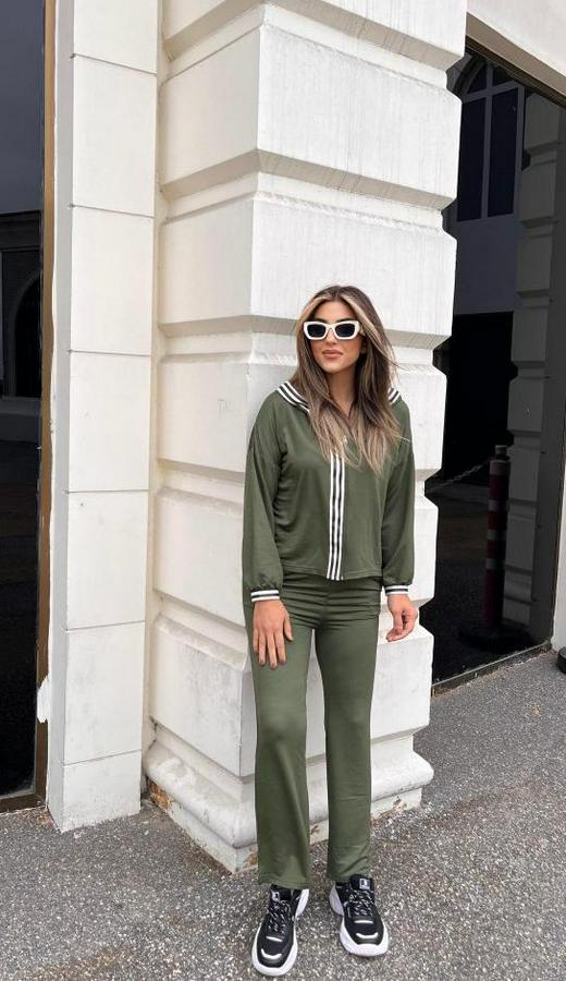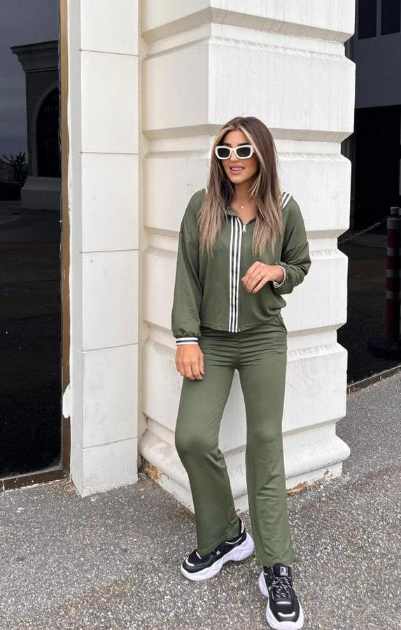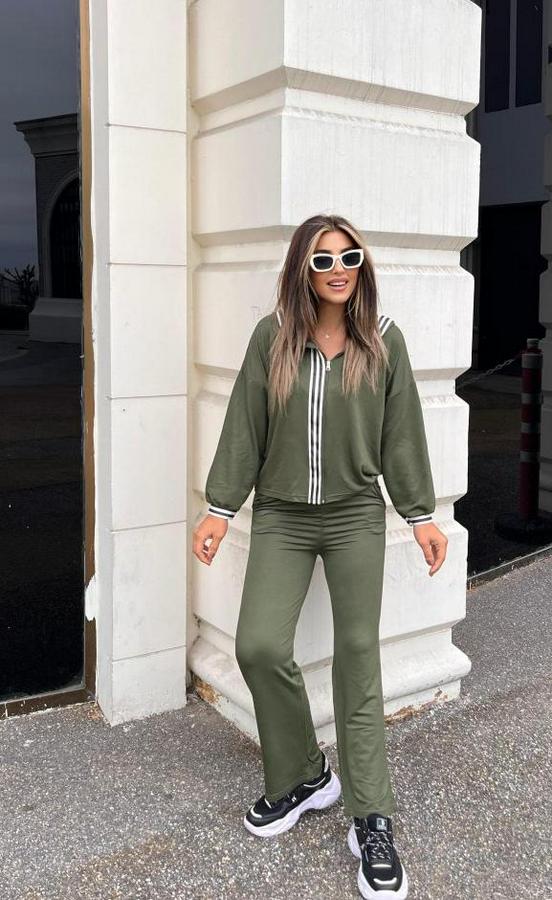 Uzun Kollu Kapşonlu Önü Fermuarlı Şerit Detay Viskon Iki Iplik Alt Üst Ikili Takım