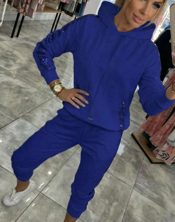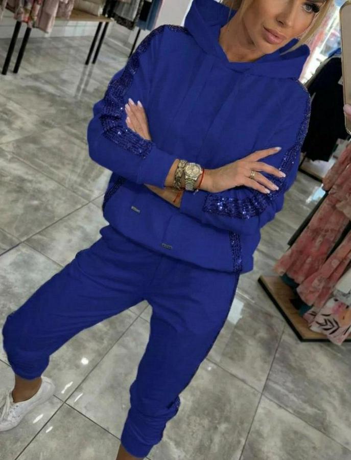 Uzun Kollu Kapşonlu Pulpayet Detay Viskon Iki Iplik Bluz Ve Pantolon Ikili Takım