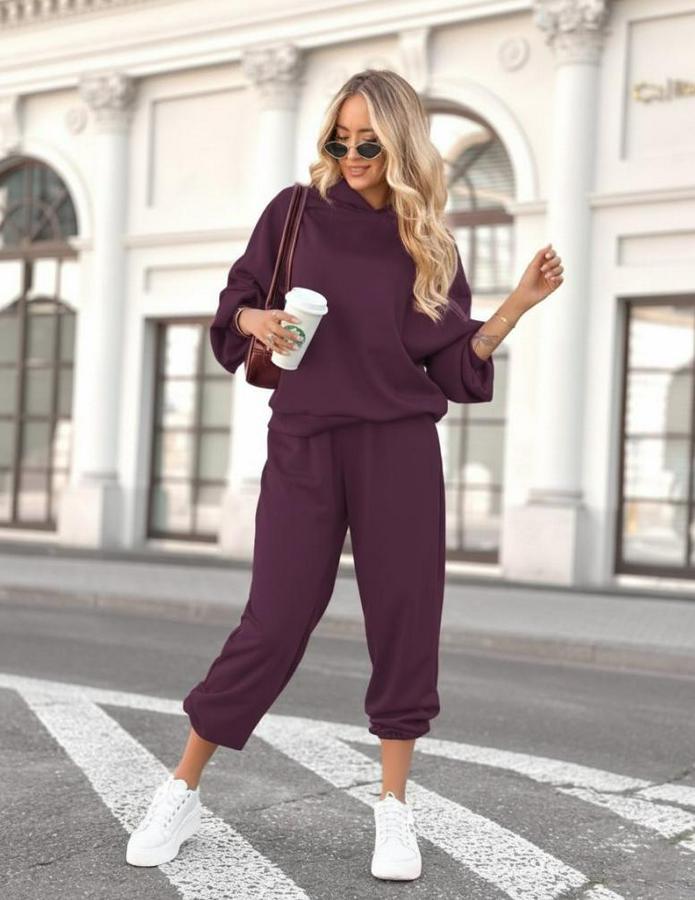 Uzun Kollu Kapşonlu Viskon Iki Iplik Bluz Ve Pantolon Ikili Takım