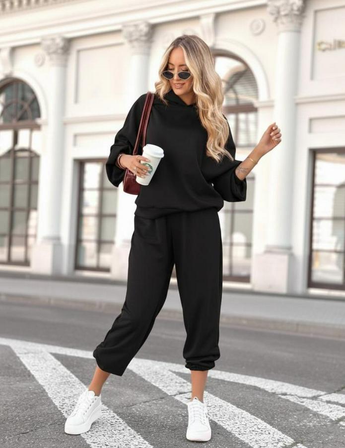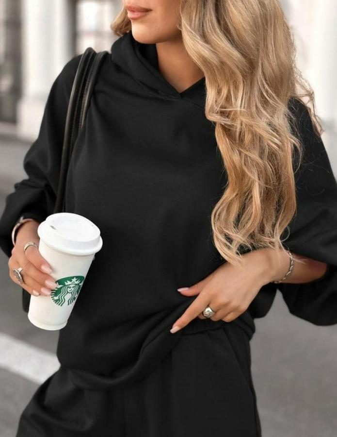 Uzun Kollu Kapşonlu Viskon Iki Iplik Bluz Ve Pantolon Ikili Takım