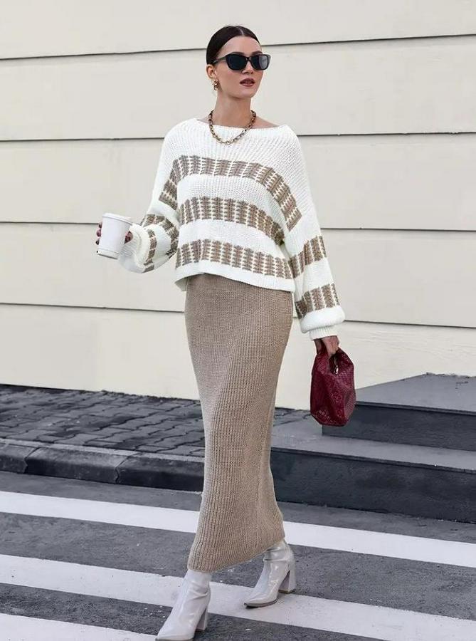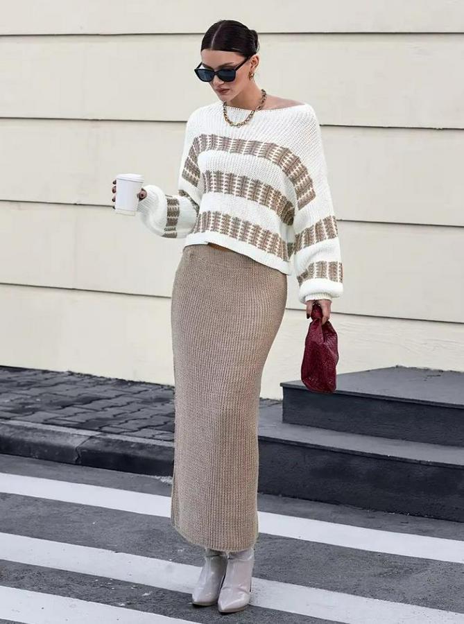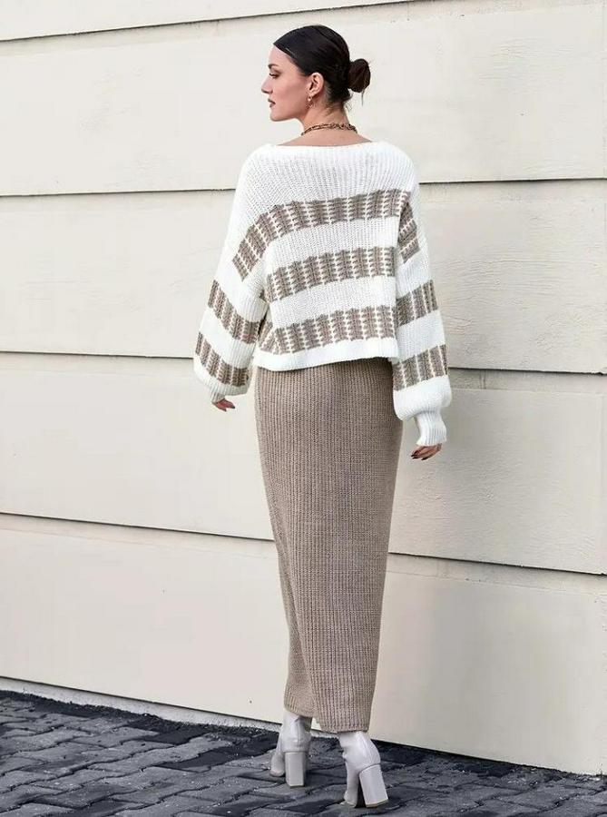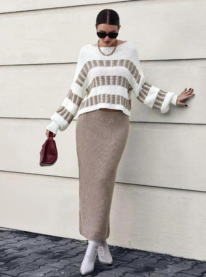 Uzun Kollu Kayık Yakalı Salaş Triko Bluz Ve Etek Ikili Takım