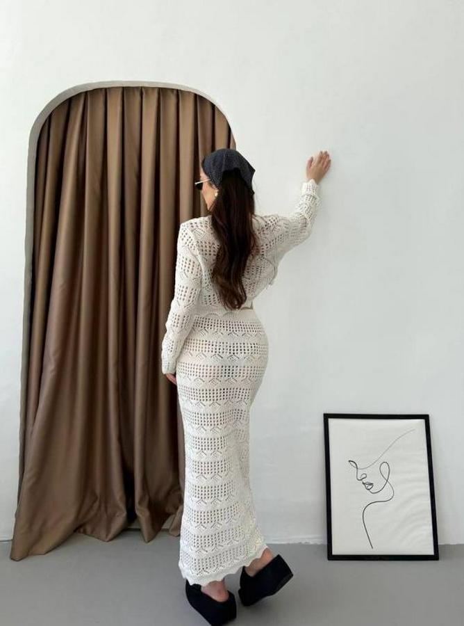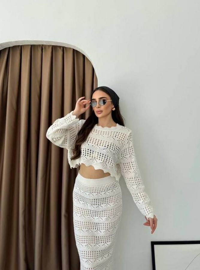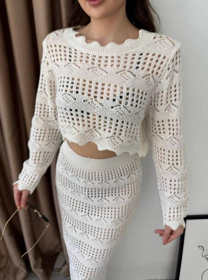 AnasayfaTüm ÜrünlerTakımlarAlt - Üst TakımUzun Kollu Kuş Gözü Transparan Detay Triko Bluz Ve Maxi Boy Etek Ikili Takım