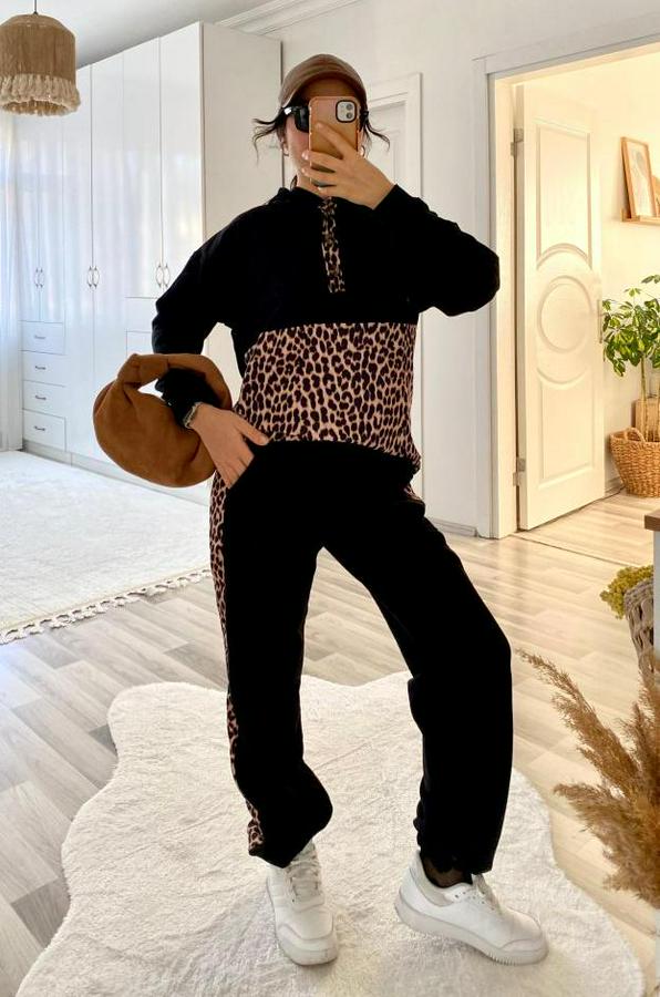 Uzun Kollu Leopar Detay Sweat Ve Yanı Leopar Şerit Detay Pantolon Ikili Takım