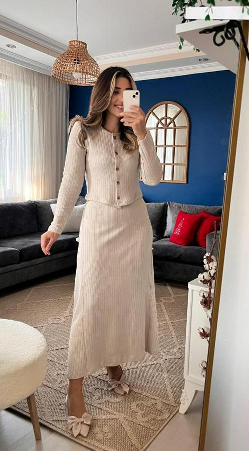 AnasayfaTüm ÜrünlerTakımlarAlt - Üst TakımUzun Kollu Önden Düğmeli Bluz Ve Yüksek Bel A Kesim Uzun Etek Şardonlu Kaşkorse Ikili Takım