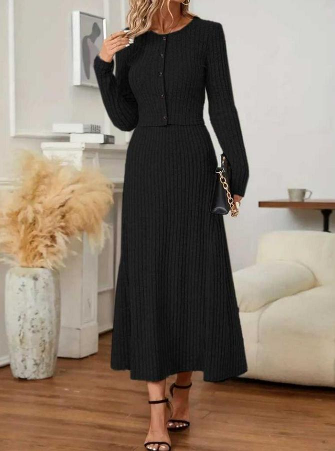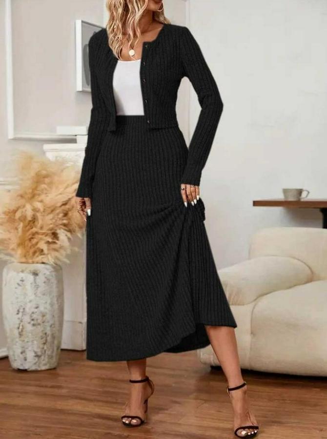 AnasayfaTüm ÜrünlerTakımlarAlt - Üst TakımUzun Kollu Önden Düğmeli Bluz Ve Yüksek Bel A Kesim Uzun Etek Şardonlu Kaşkorse Ikili Takım