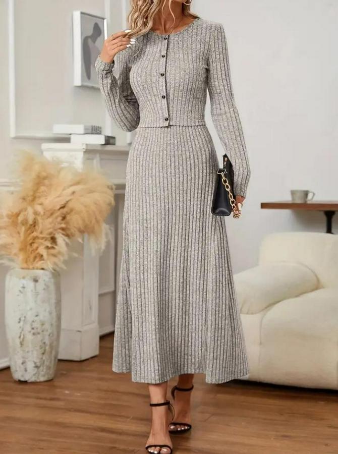 AnasayfaTüm ÜrünlerTakımlarAlt - Üst TakımUzun Kollu Önden Düğmeli Bluz Ve Yüksek Bel A Kesim Uzun Etek Şardonlu Kaşkorse Ikili Takım