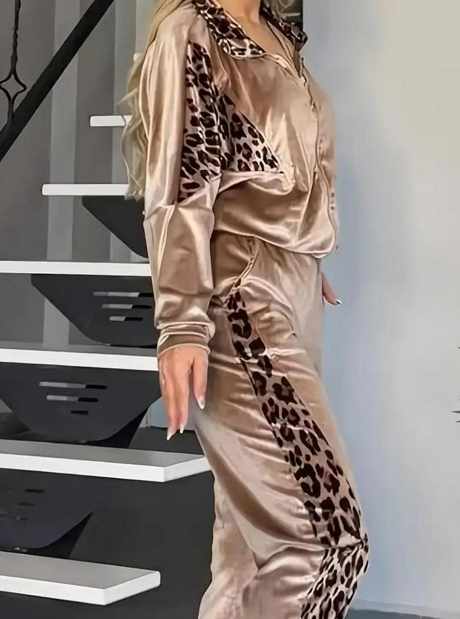 Uzun Kollu Önden Fermuarlı Leopar Detaylı Kadife Bal Köpüğü Bluz Ve Pantolon Ikili Takım