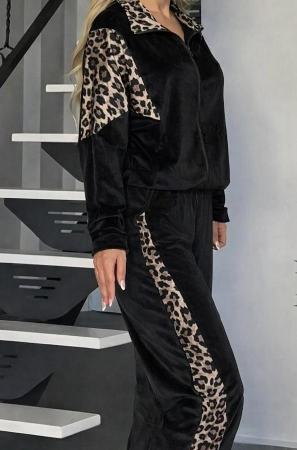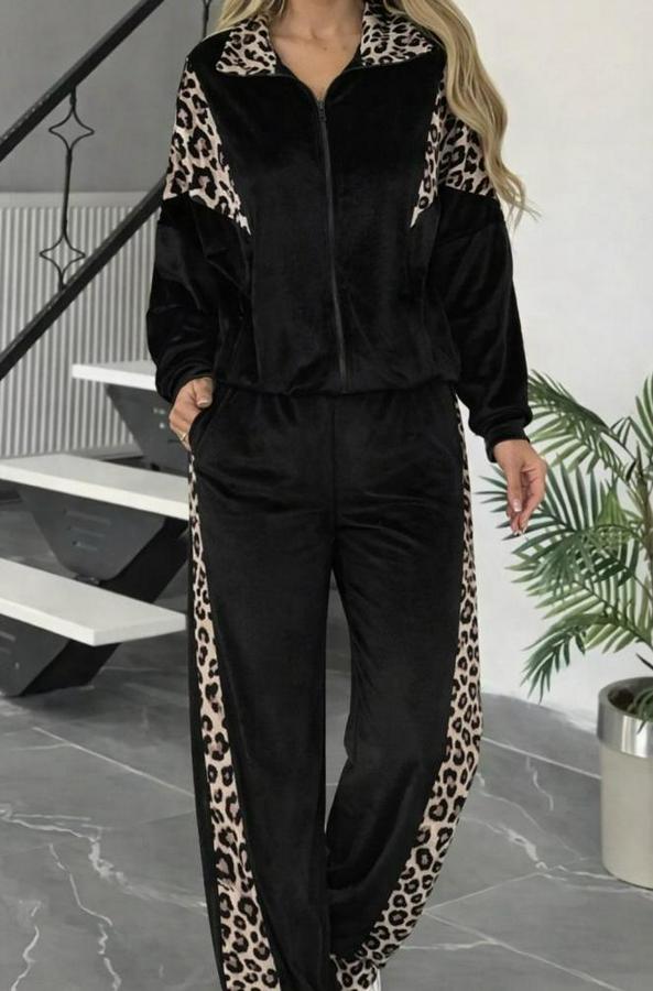 Uzun Kollu Önden Fermuarlı Leopar Detaylı Kadife Bluz Ve Pantolon Ikili Takım