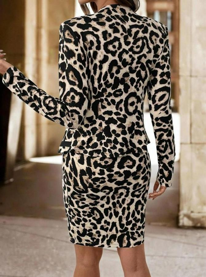 Uzun Kollu Önü Açık Leopar Desen Modal Ceket Ve Etek Ikili Takım