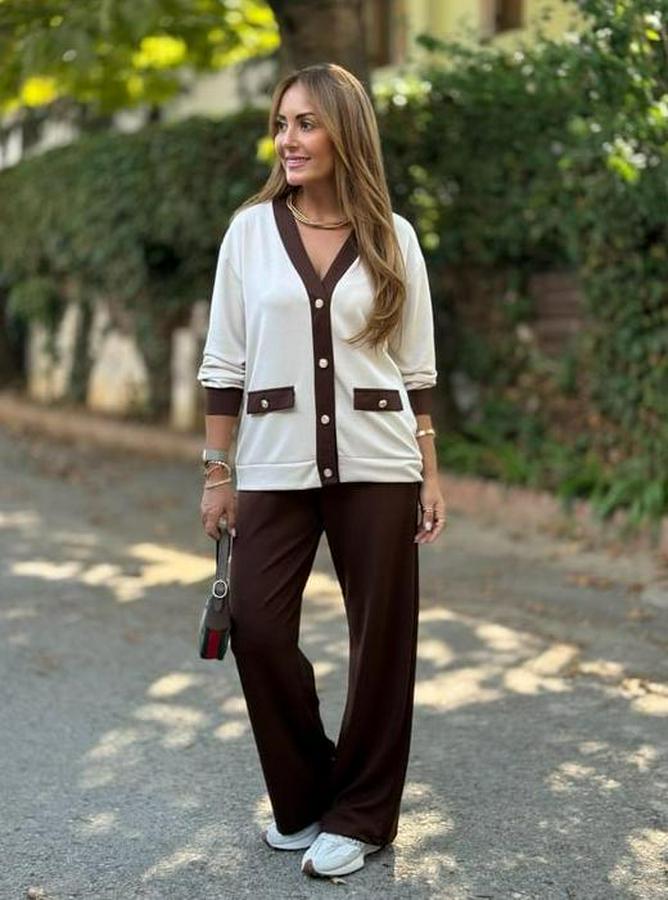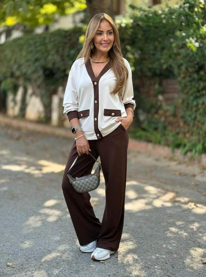 Kadın Uzun Kollu Ribanali Cep Detay Hırka Ve Bol Paça Pantolon Ikili Takım