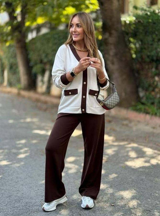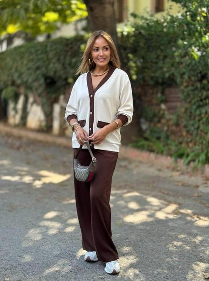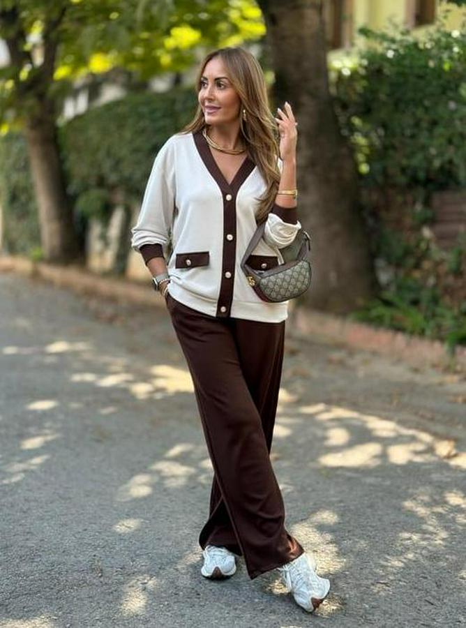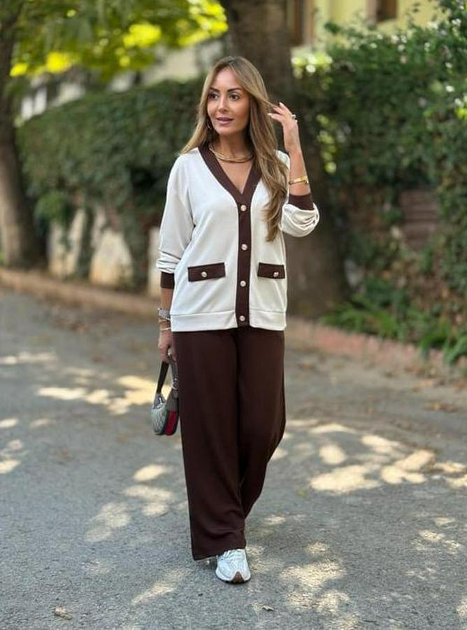 Uzun Kollu Ribanali Cep Detay Hırka Ve Bol Paça Pantolon Ikili Takım