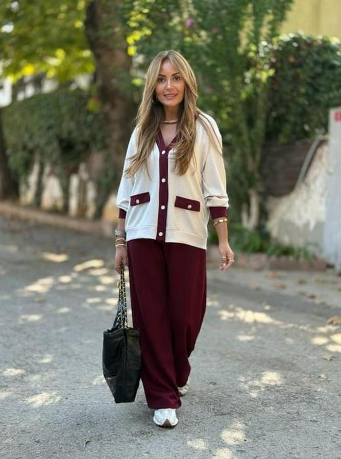 Uzun Kollu Ribanali Cep Detay Hırka Ve Bol Paça Pantolon Ikili Takım