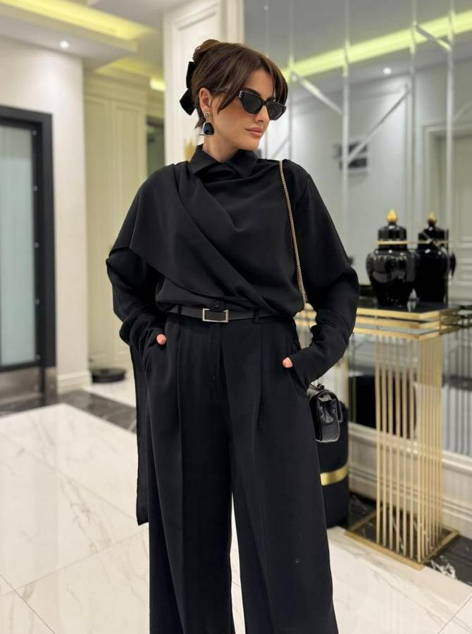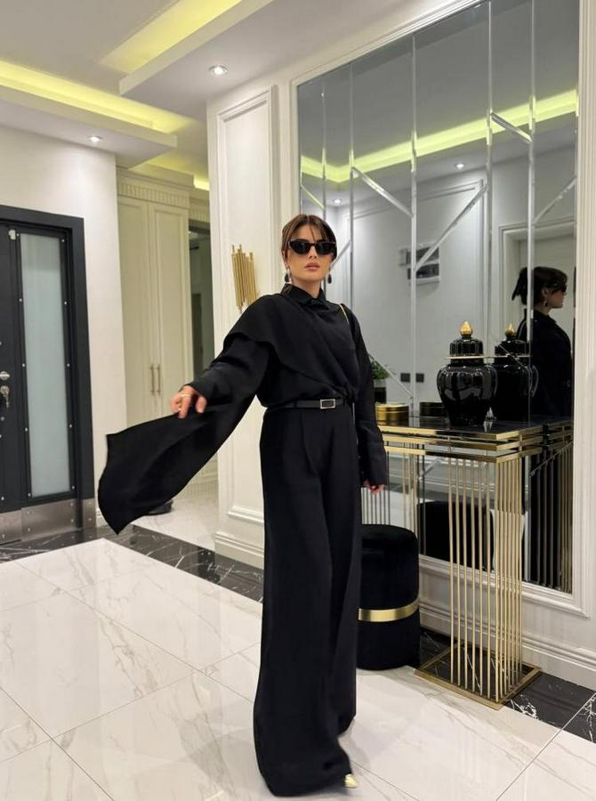 Uzun Kollu Şal Detaylı Bluz Ve Pantolon Kemer Dahil Ikili Takım