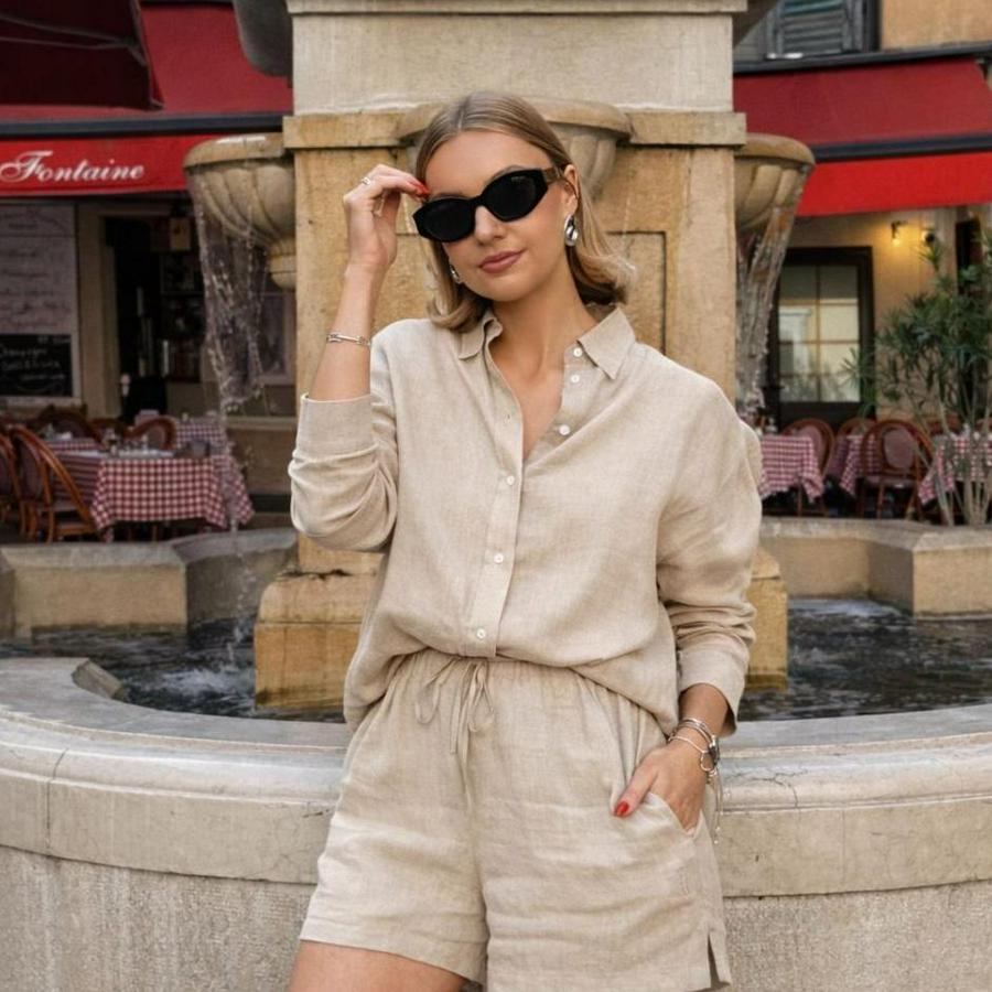 Uzun Kollu Salaş Gömlek Ve Şort Keten Ikili Takım