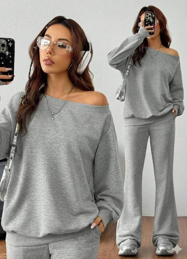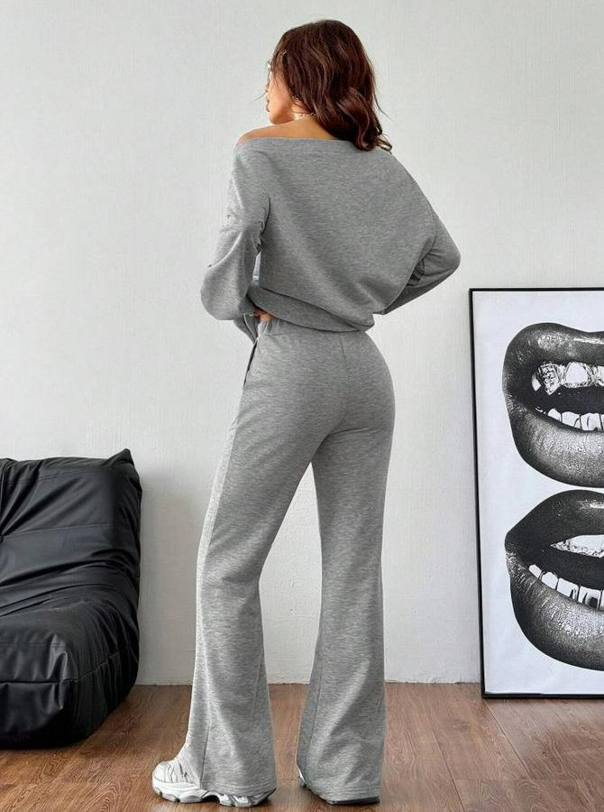 Kadın Uzun Kollu Tek Omuzdan Açık Iki Iplik Bluz Ve Pantolon Ikili Takım