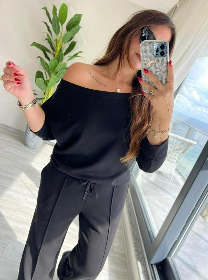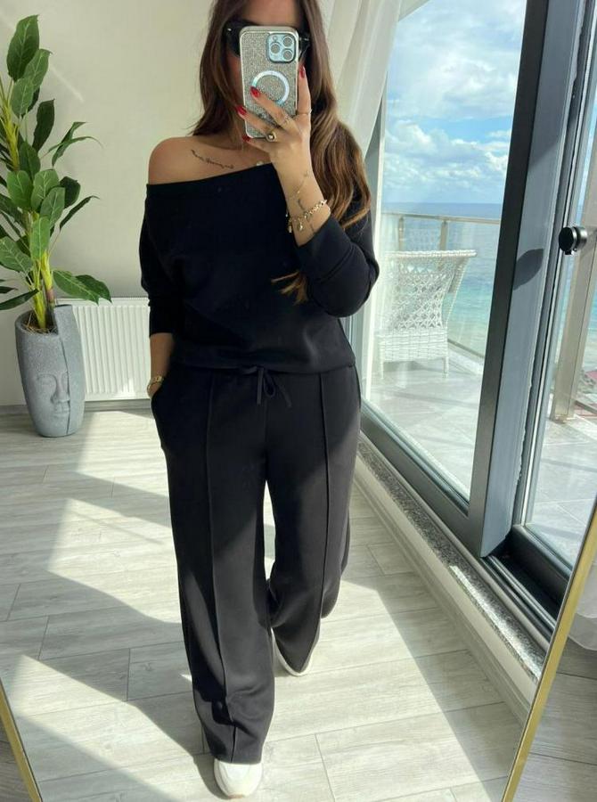 Uzun Kollu Tek Omuzdan Açık Modal Bluz Ve Pantolon Ikili Takım
