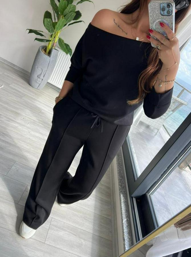 Kadın Uzun Kollu Tek Omuzdan Açık Modal Bluz Ve Pantolon Ikili Takım