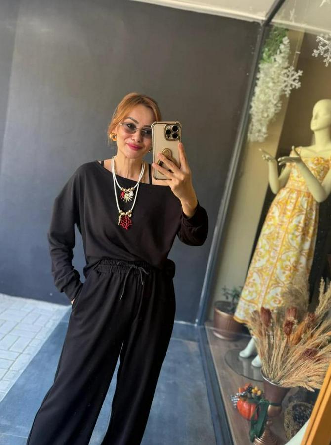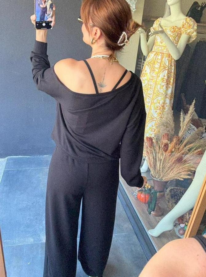 Kadın Uzun Kollu Tek Omuzdan Açık Viskon Iki Iplik Bluz Ve Pantolon Ikili Takım