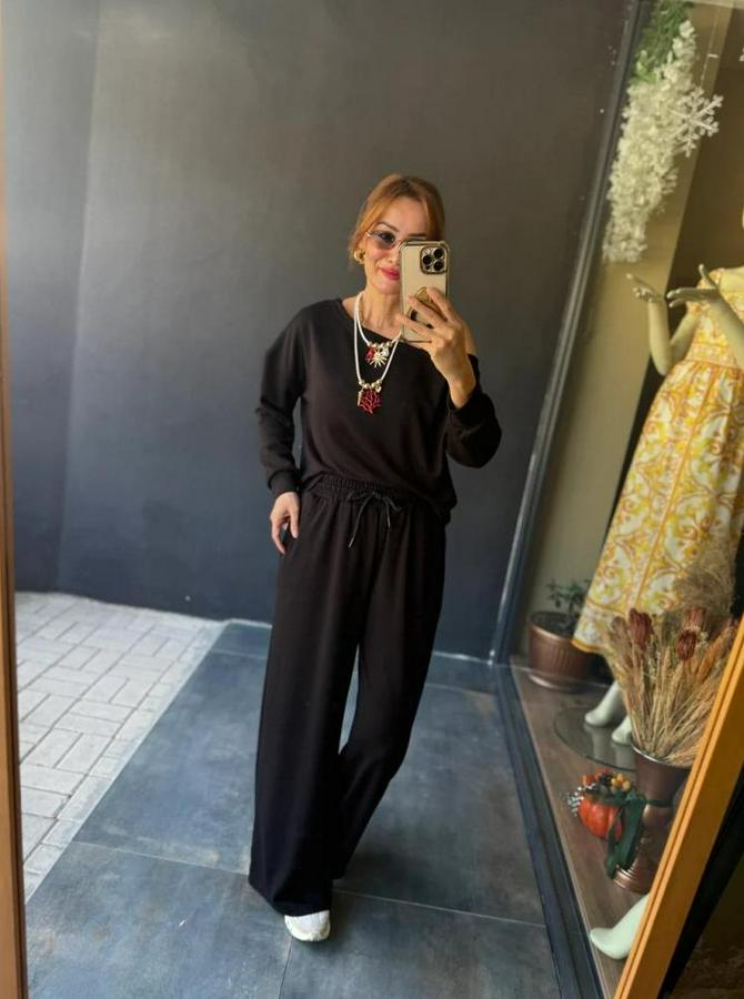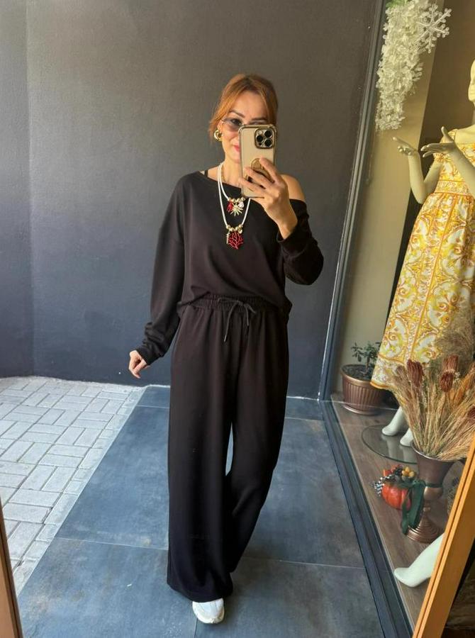 AnasayfaTüm ÜrünlerTakımlarAlt - Üst TakımUzun Kollu Tek Omuzdan Açık Viskon Iki Iplik Bluz Ve Pantolon Ikili Takım
