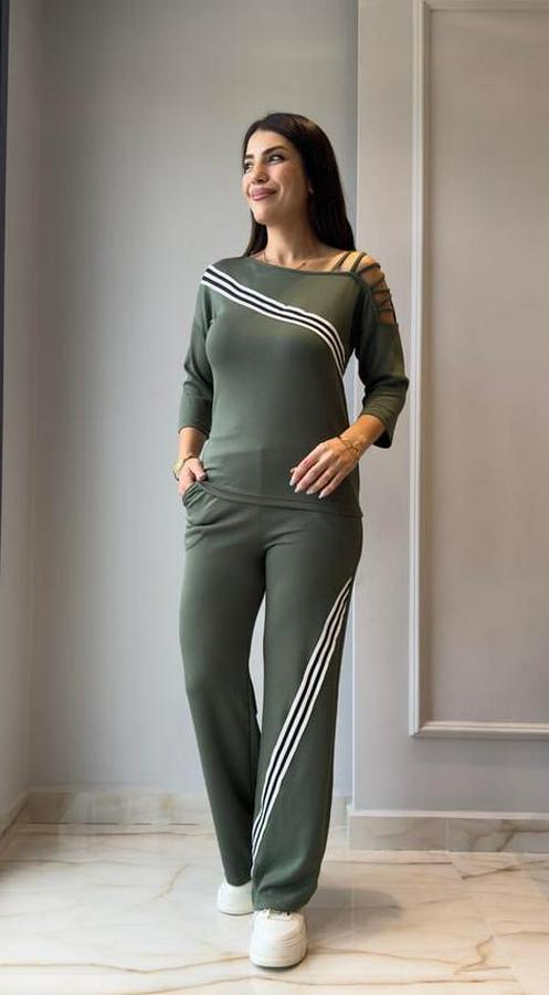 Uzun Kollu Truvakar Kol Tek Omuz Çapraz Şerit Detaylı Ribanalı Viskon Iki Iplik Bluz Ve Pantolon Ikili Takım