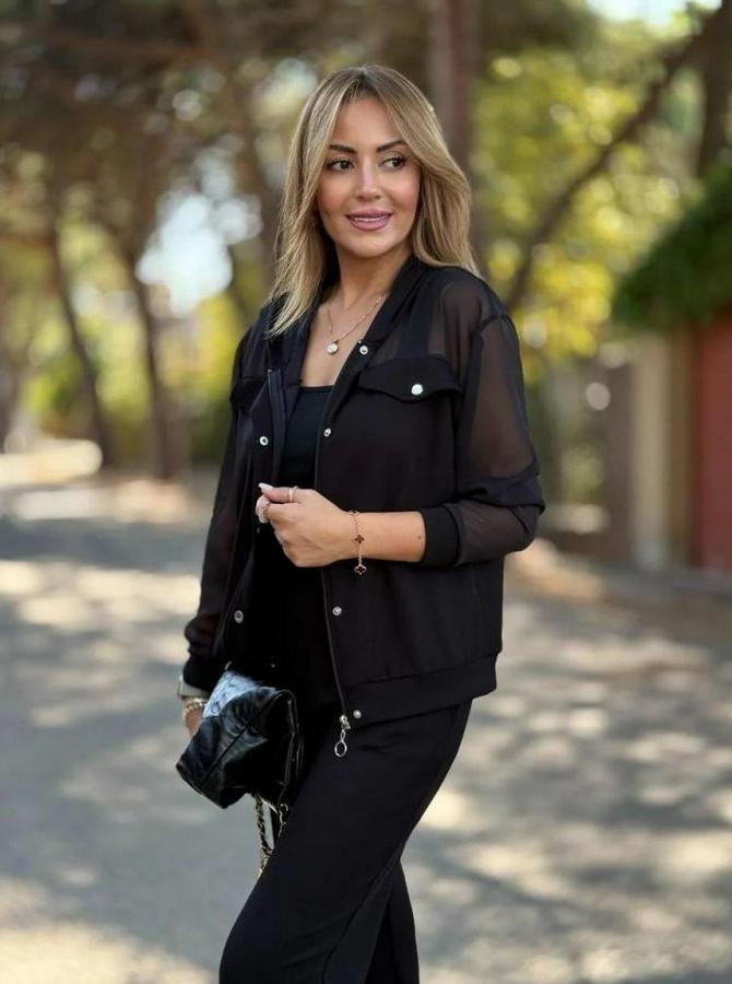 Kadın Uzun Kollu Tül Detaylı önü Düğmeli Viskon Iki Iplik Ceket Ve Pantolon Ikili Takım