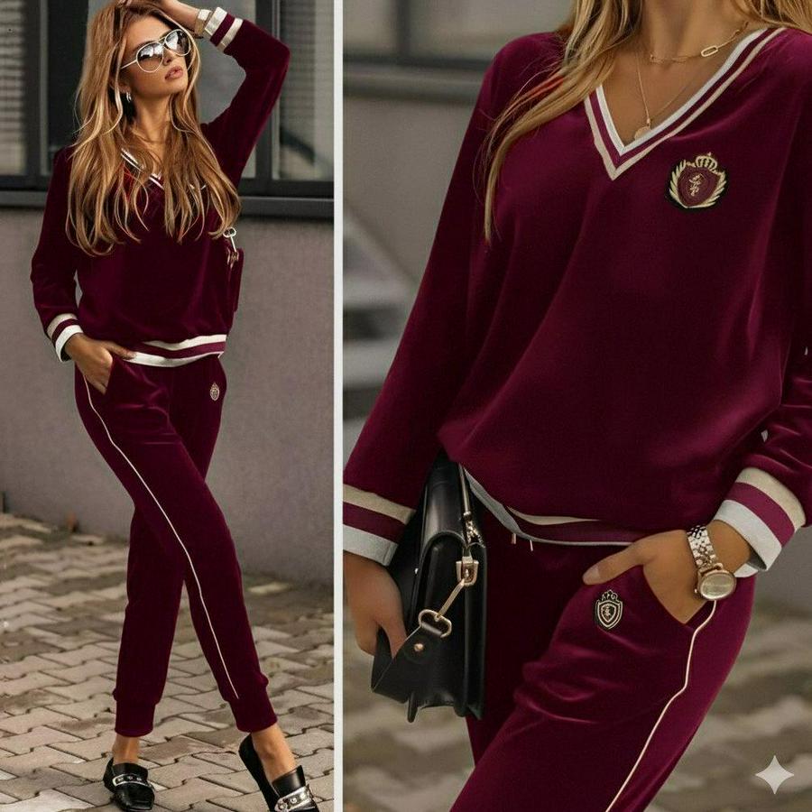 Kadın Uzun Kollu V Yaka Yakası Ve Kol Ağzı şerit Detay Kadife Takım