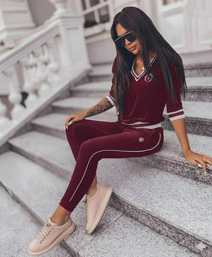 Uzun Kollu V Yaka Yakası Ve Kol Ağzı Şerit Detay Kadife Takım