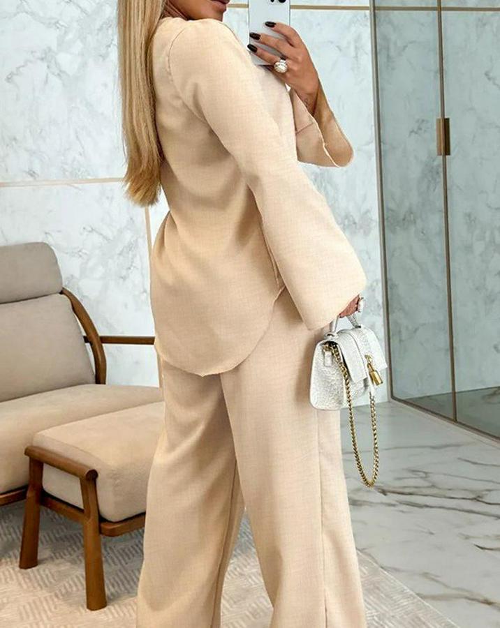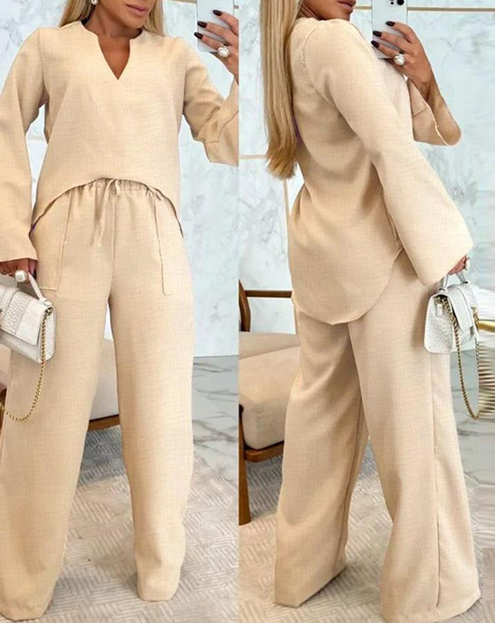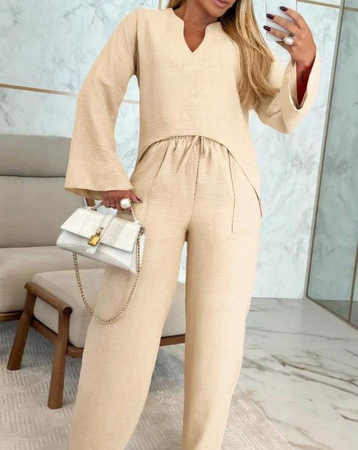 Uzun Kollu V Yakalı Keten Bluz Bağcıklı Pantolon Ikili Takım