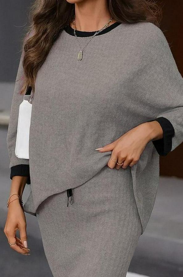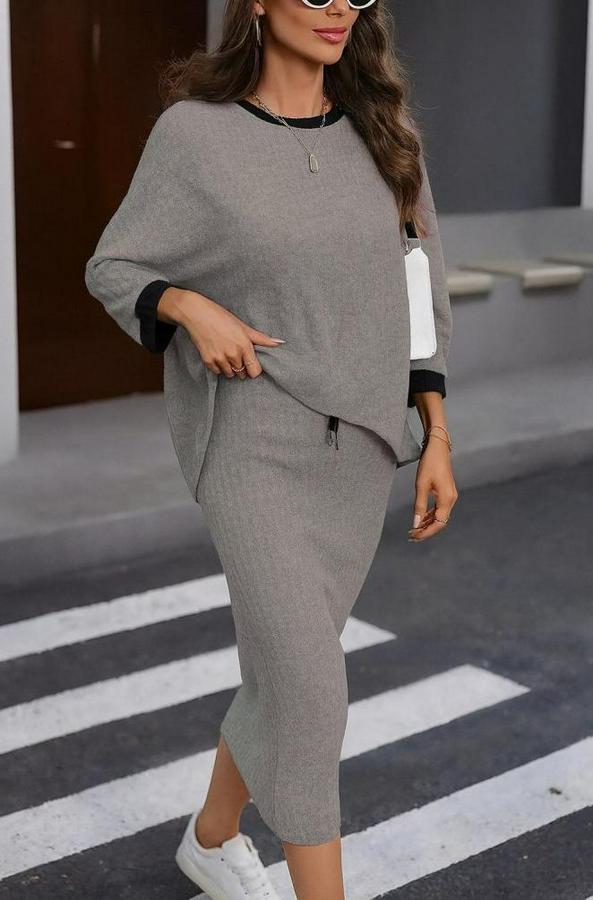 Uzun Kollu Yakası Açık Şardonlu Kaşkorse Bluz Ve Eteği Bağcıklı Ikili Takım