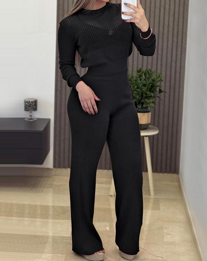 AnasayfaTüm ÜrünlerTakımlarAlt - Üst TakımUzun Kollu Yuvarlak Yaka Transparan Detaylı Triko Bluz Ve Pantolon Ikili Takım