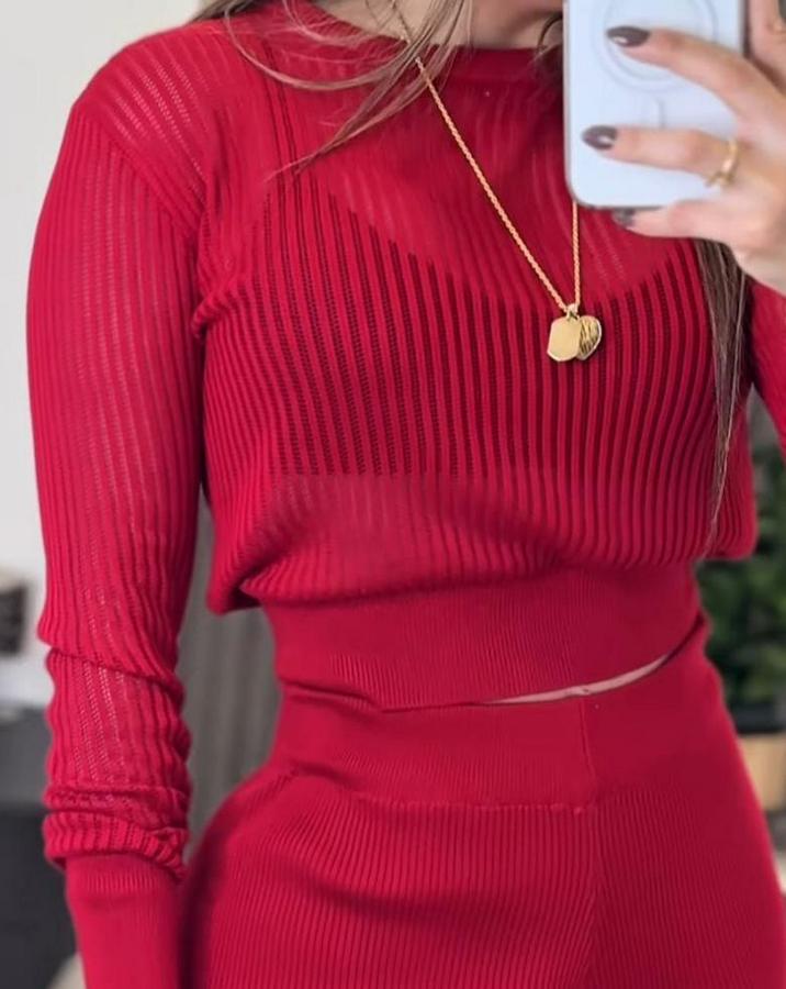 Uzun Kollu Yuvarlak Yaka Transparan Detaylı Triko Bluz Ve Pantolon Ikili Takım