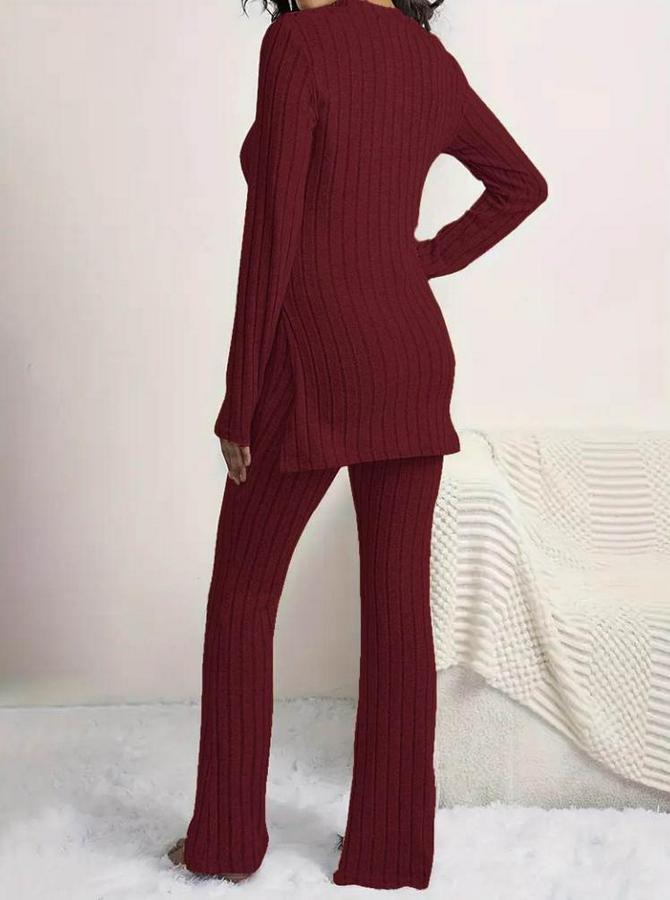 Kadın Uzun Kollu Yuvarlak Yaka Yandan Yırtmaç Detaylı şardonlu Kaşkorse Bluz Ve Pantolon Ikili Takım