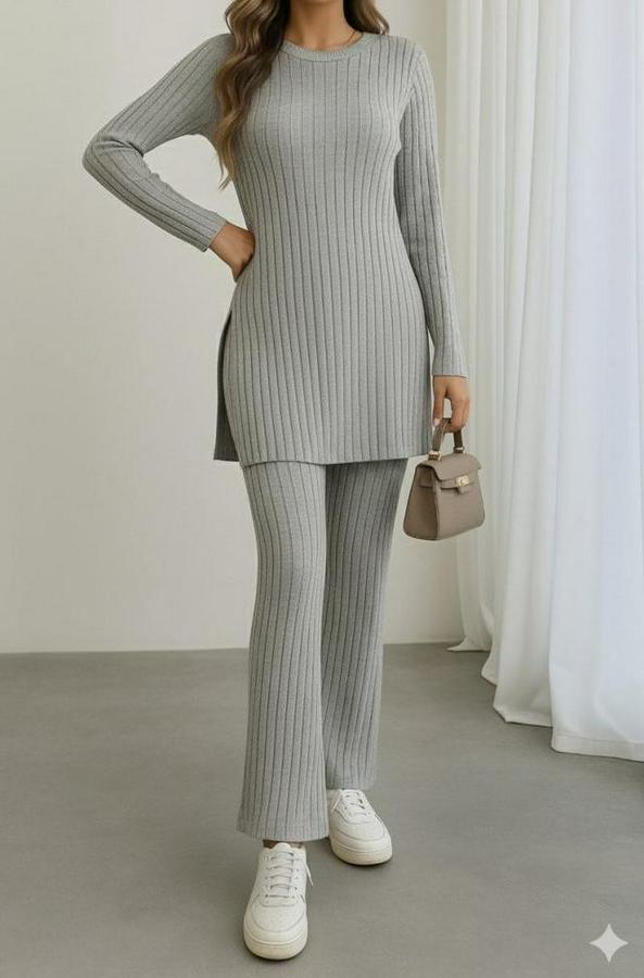 Uzun Kollu Yuvarlak Yaka Yandan Yırtmaç Detaylı Şardonlu Kaşkorse Bluz Ve Pantolon Ikili Takım