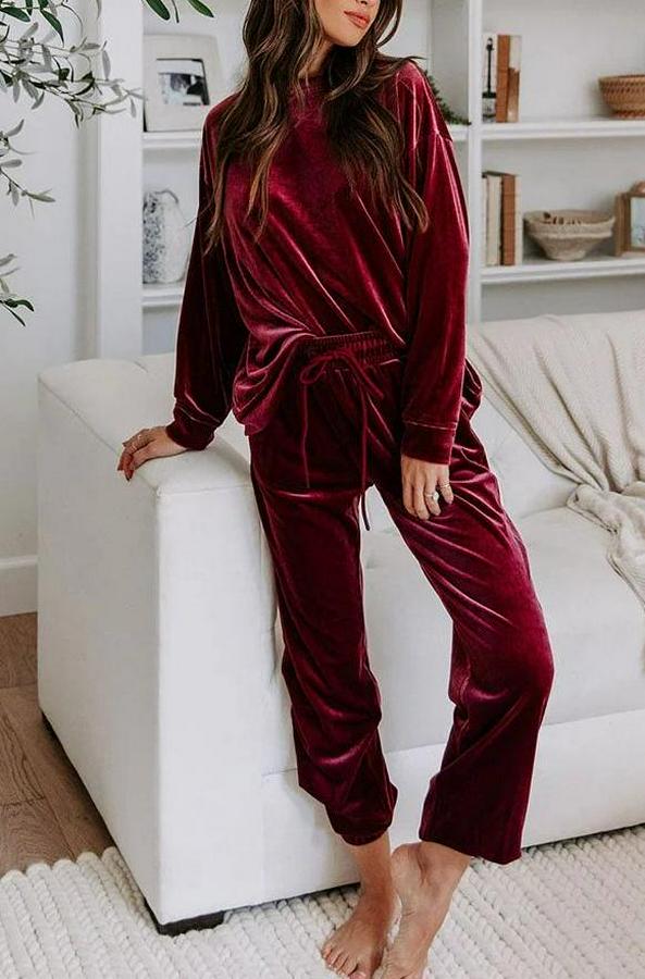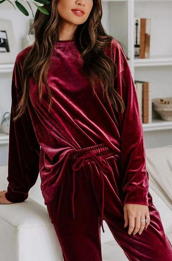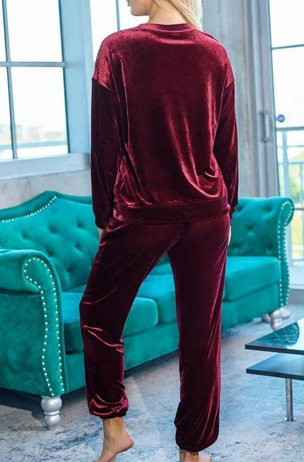 Uzun Kollu Yuvarlak Yakalı Kadife Bluz Ve Pantolon Takım