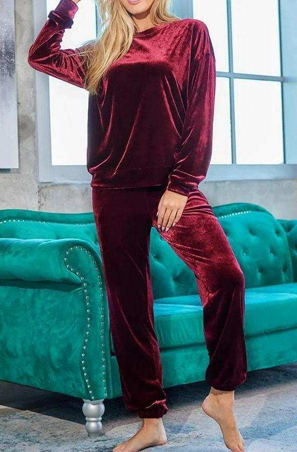 Kadın Uzun Kollu Yuvarlak Yakalı Kadife Bluz Ve Pantolon Takım