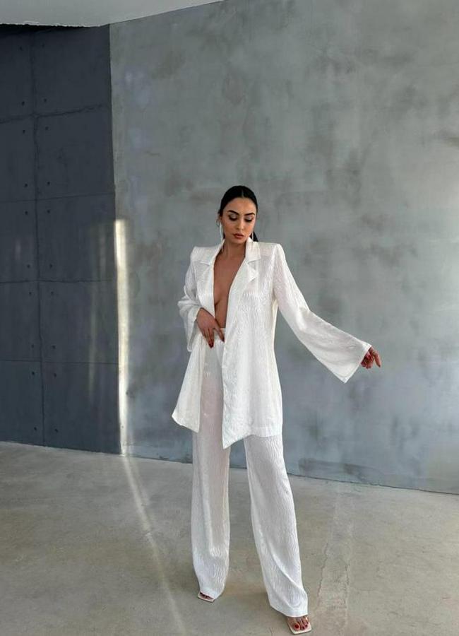 VİSKON JAKARLI BAĞLAMALI GÖMLEK - PANTOLON TAKIM - Beyaz