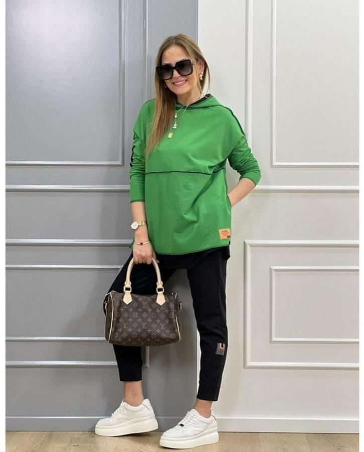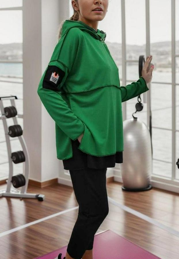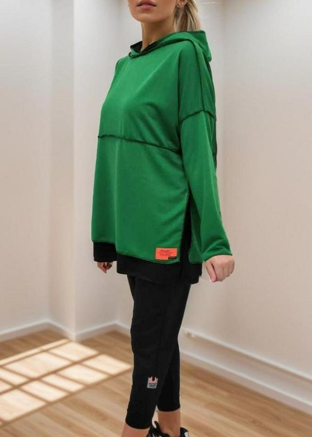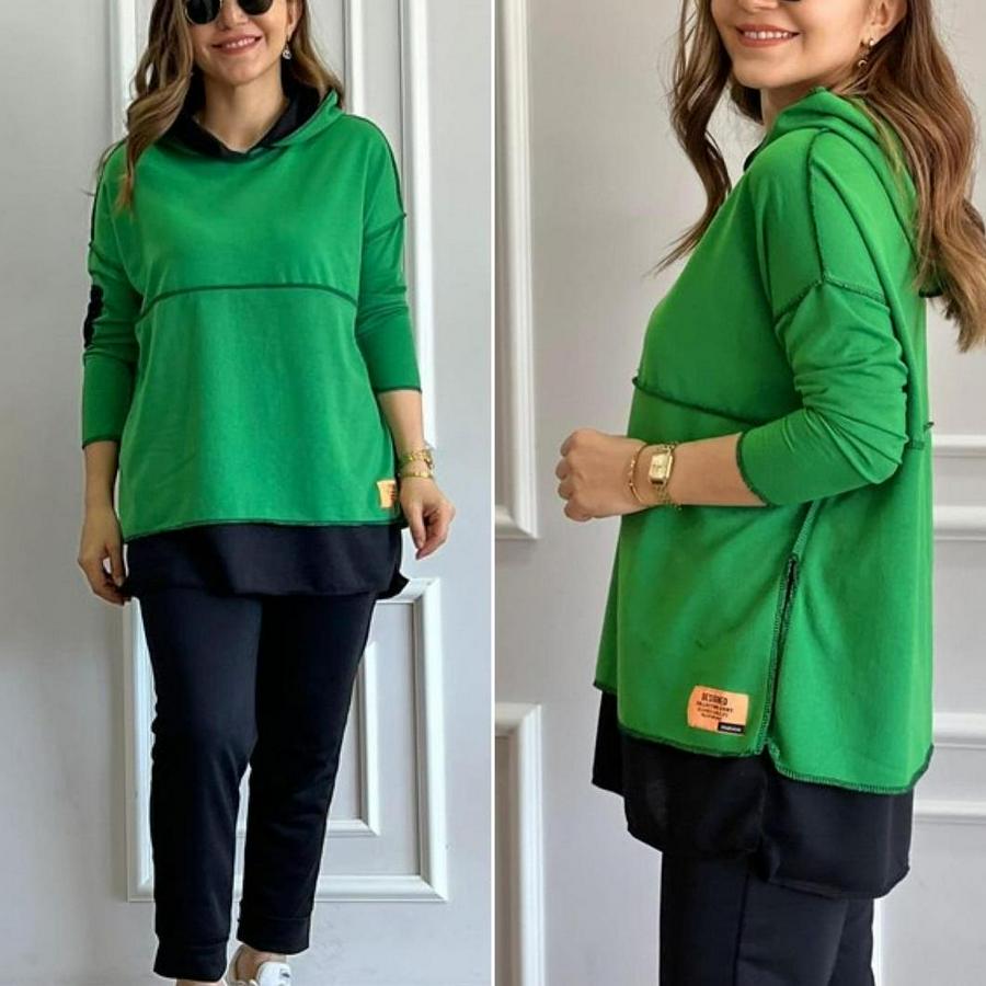 Kadın Yeşil Kapşonlu Etek Ucu Detay Arma Ters Dikiş Gorunumlu Ikili Takım